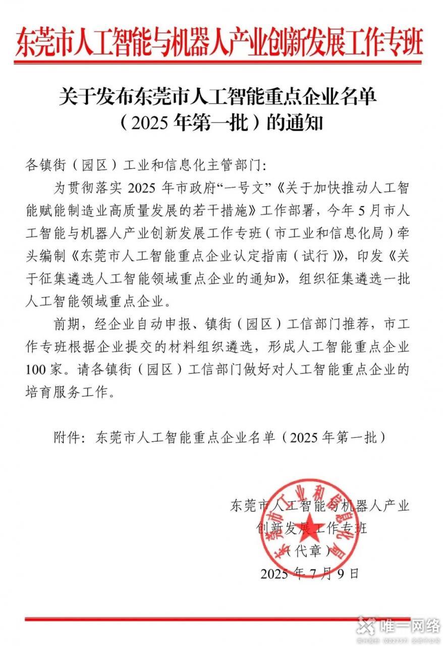 近日,東莞市人工智能與機器人產(chǎn)業(yè)創(chuàng)新發(fā)展工作專班正式發(fā)布《東莞市人工智能重點企業(yè)名單(2025 年第一批)》,唯一網(wǎng)絡憑借在人工智能領(lǐng)域的戰(zhàn)略布局、技術(shù)積淀與產(chǎn)